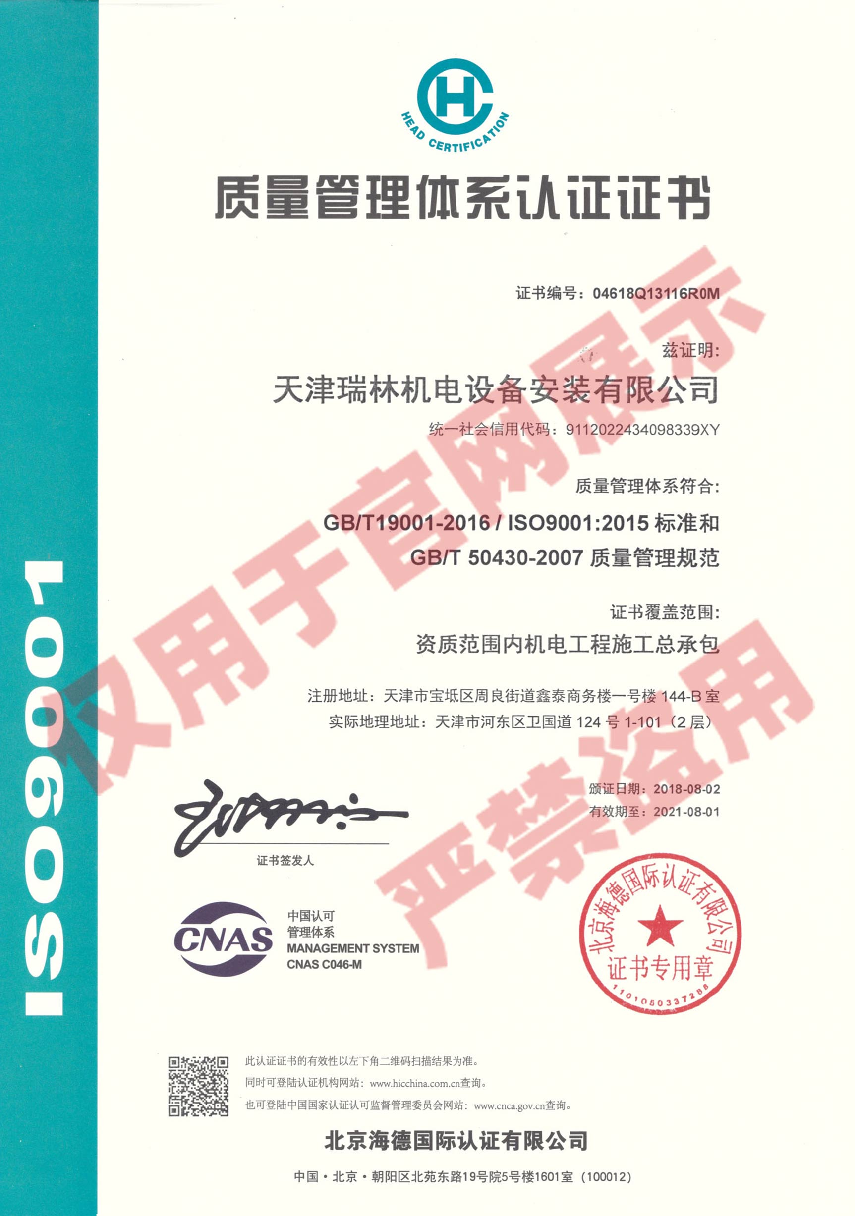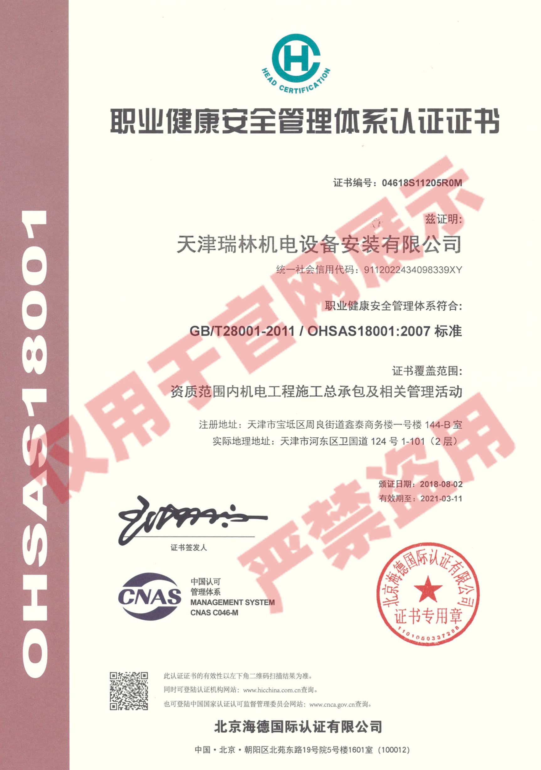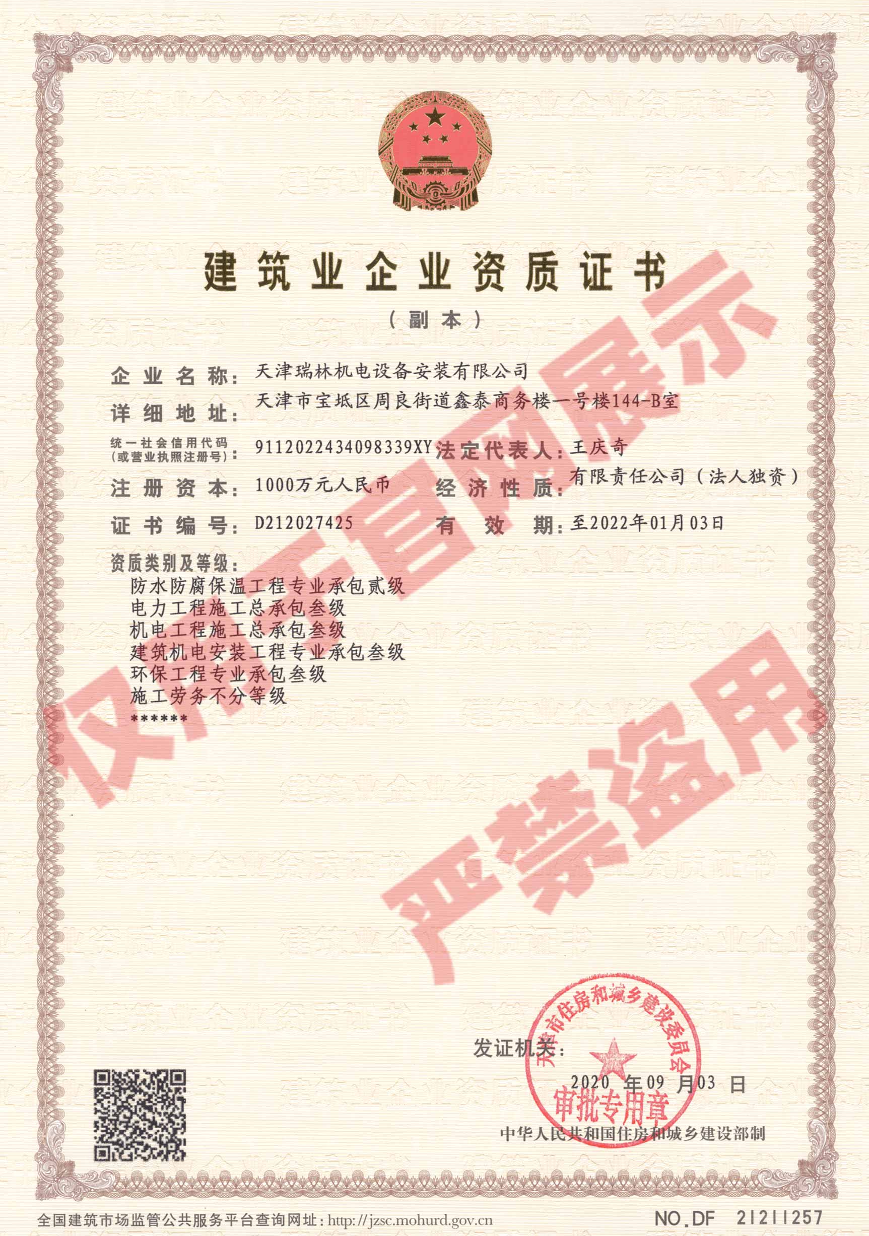 公司目前擁有電力工程施工總承包三級、機電工程施工總承包三級資質、建筑機電安裝工程專業承包三級資質、環保工程專業承包三級資質等,2017年獲得安全生產許可證,2018年公司通過 OHSAS18001安全體系認證,ISO19001質量體系認證、ISO14001環境體系認證三貫標。