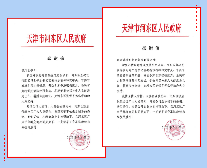 誠瑞達集團的捐贈行動,受到河?xùn)|區(qū)人民政府的高度評價,并于2月29日,向集團公司發(fā)來感謝信兩封,對翟茂董事長和誠瑞達集團以關(guān)愛河?xùn)|區(qū)人民健康為己任,捐贈防疫物資,為河?xùn)|區(qū)提供無私幫助與支持表示敬意與感謝。